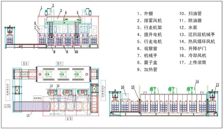 人工將工件首先放入小工件籃內(nèi),再將小工件籃放置于吊籃內(nèi),然后將吊籃放在上件處滾筒平臺上(自動(dòng)定位)。整套設(shè)備由PLC可編程控制器控制,機(jī)械手自動(dòng)將吊籃放入超聲波除油槽,清洗時(shí)間(節(jié)拍)根據(jù)工件的產(chǎn)量及工件的污染狀態(tài)可調(diào),到達(dá)設(shè)定時(shí)間后,機(jī)械手依次將吊籃放入下道清洗槽,直至將吊籃放入過渡區(qū)輸送鏈上:然后由迂回轉(zhuǎn)角機(jī)械手將吊籃放入烘干爐上件段輸送鏈上,經(jīng)烘干、風(fēng)冷,然后再由迂回轉(zhuǎn)角機(jī)械手將吊籃放入清洗段上件輸送滾筒上(注:設(shè)備上、下件為同一工位)。